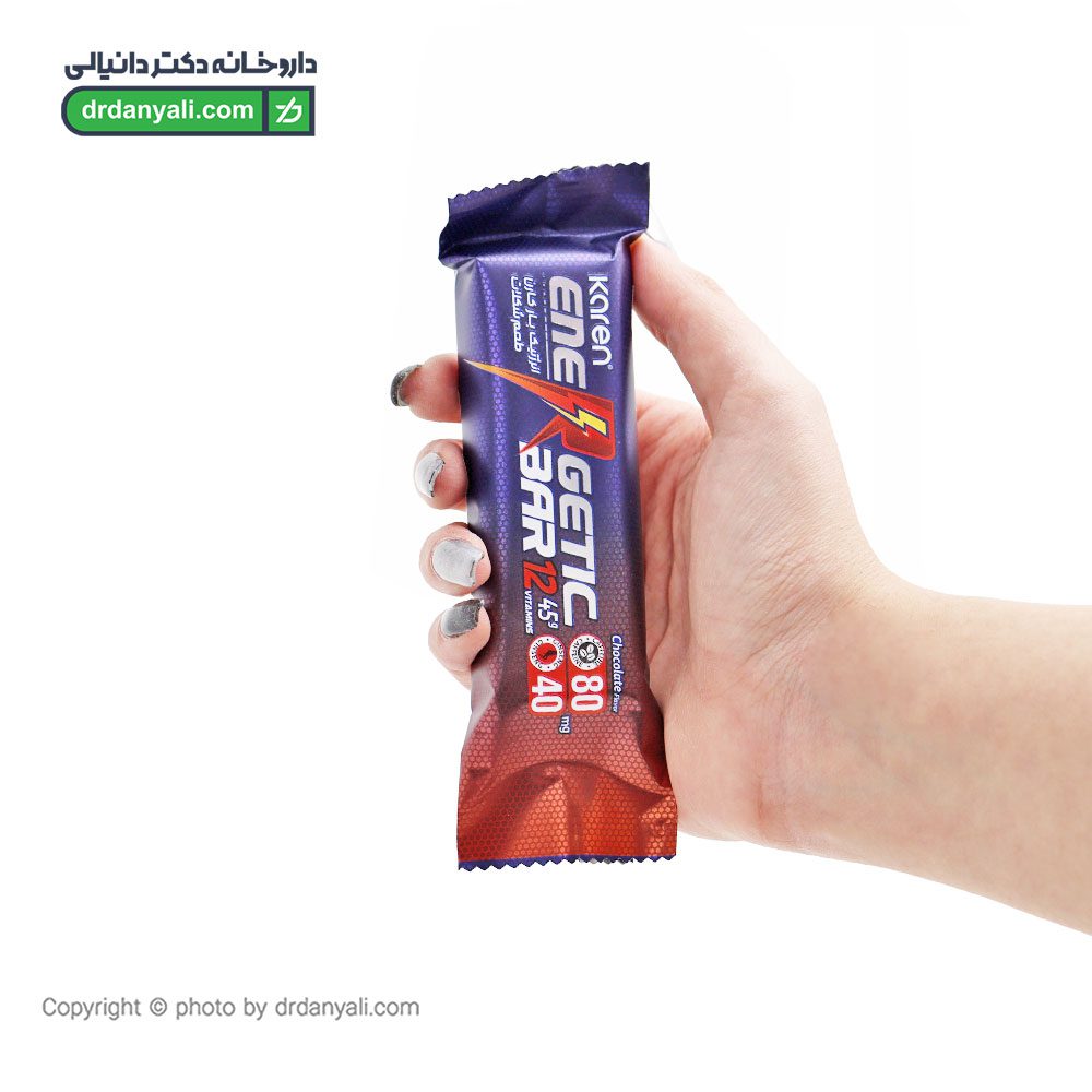 انرژی بار کارن یک شکلات مغذی است که مصرف آن به تامین انرژی، تاخیر خستگی و افزایش تمرکز و هوشیاری کمک می کند. شکلات انرژی زا کارن، مخلوطی از پروتئین آب پنیر و شیر است که انرژی مورد نیاز روزانه افراد را تامین نموده و احساس خستگی را به تاخیر می اندازد. این فرآورده حاوی 8 گرم پروتئین، کربوهیدرات، ویتامین ها و مواد معدنی، جینسینگ و کافئین است. انرژتیک بار کارن، به علاوه حاوی 577 میلی گرم اسید آمینه ال-آرژنین برای بهبود خون رسانی به عضلات بوده و برای استفاده افراد ورزشکار و غیر ورزشکار مفید است.