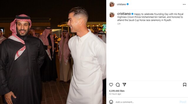 رونالدو در این پست نوشت: خوشحالم که روز تاسیس را در کنار محمد بن سلمان، ولیعهد عربستان سعودی جشن میگیرم.