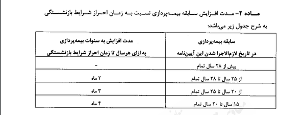 همچنین در اجرای این ماده سابقه بیمه پردازی کمتر از یک سال به نسبت مورد محاسبه قرار می گیرد. در همین حال اجرای تمام یا بخشی از این ماده در خصوص افزایش سنوات الزامی بازنشستگی مشروط بر آن است که سن بیمه پرداز در زمان بازنشستگی برای مردان از ۶۲ سال تمام و برای زنان از ۵۵ سال تمام بیشتر نباشد.