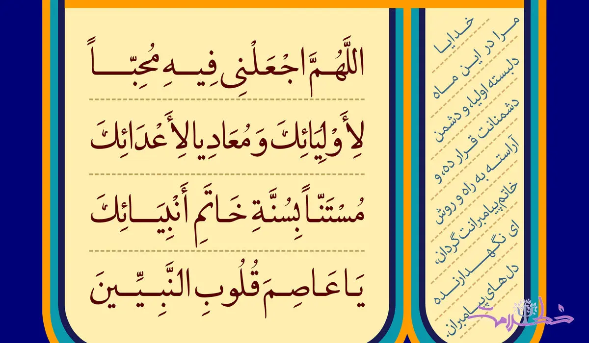 اللَّهُمَّ اجْعَلْنِی فِیْهِ مُحِبّا لاَوْلِیآئِکَ، وَمُعادِیا لاَعْدائِکَ، مُسْتَنّا بِسُنَّةِ خاتَمِ أَنْبِیائِکَ، یا عاصِمَ قُلُوبِ النَّبِیِّینَ.