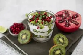 بر روی ماست، مقداری انار و کیوی بریزید.