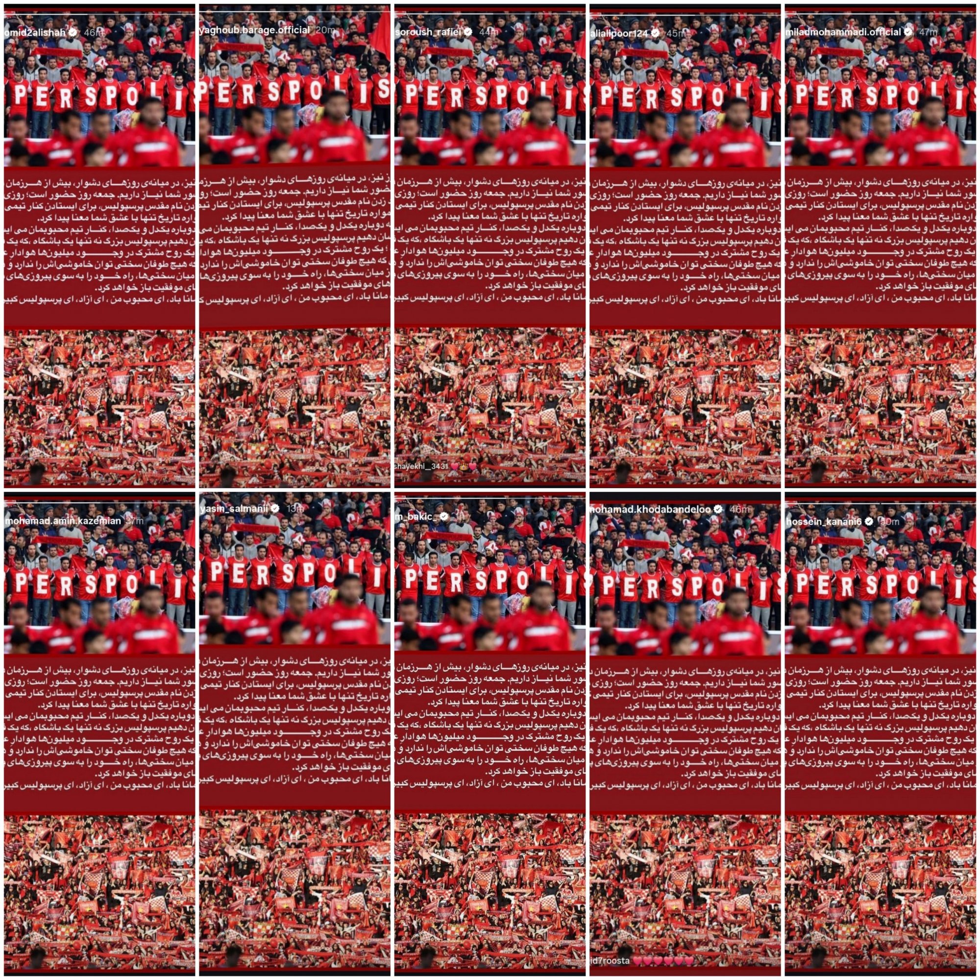 بازیکنان پرسپولیس با انتشار یک استوری مشترک از هواداران خواستند روز جمعه این تیم را تنها نگذارند.