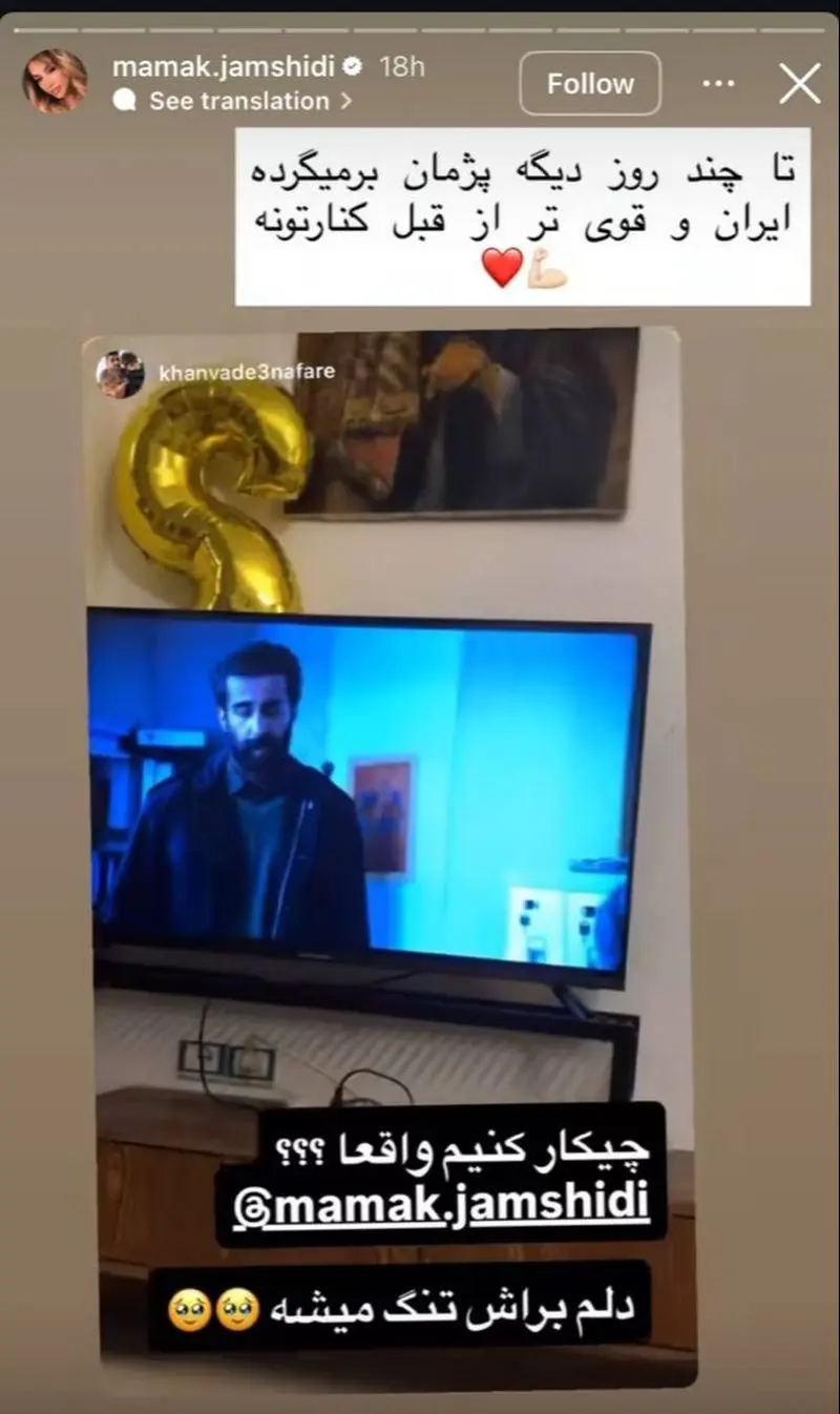 او در پاسخ به پرسش یکی از دنبالکنندگان درباره بازگشت پژمان جمشیدی به ایران نوشت: تا چند روز دیگه پژمان برمیگرده ایران و قویتر از قبل کنارتونه.