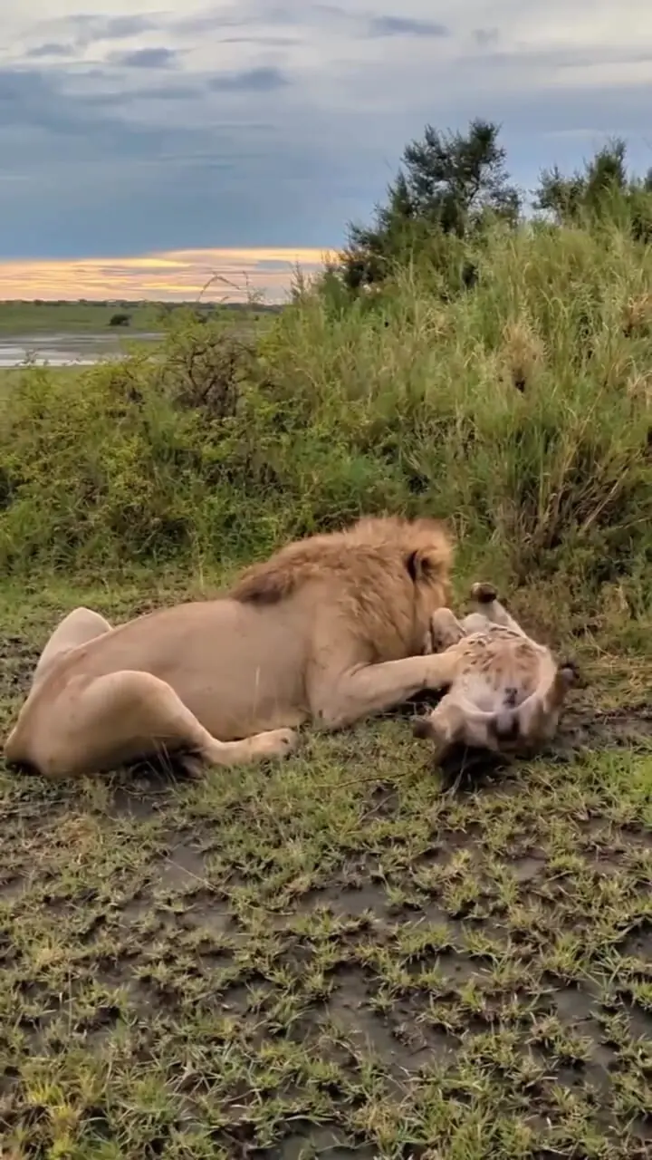 فیلم شیر در حال محافظت از قلمرو در برابر کفتارها