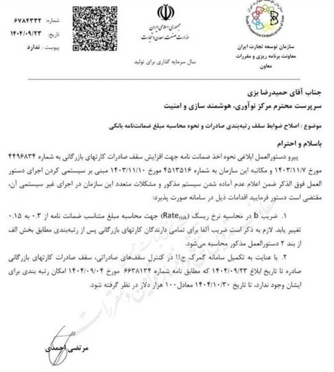 طبق ابلاغیه سازمان توسعه تجارت، سقف صادرات کارتهای بازرگانی صادره از ۲۳ آذر ماه که امکان رتبه بندی برای آنها وجود ندارد تا ۳۰ دی ماه ۱۴۰۴ معادل ۱۰۰ هزار دلار تعیین شده است.