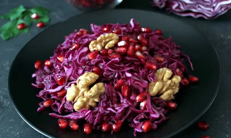سالاد انار با ترکیب رنگارنگی از کلم سفید و بنفش، دانه‌های انار و گردو، گزینه‌ای مغذی برای سفره شب یلداست. این سالاد به دلیل فیبر بالا، آنتی‌اکسیدان‌ها و اسیدهای چرب مفید، می‌تواند به سلامت گوارش، قلب و سیستم ایمنی کمک کند.