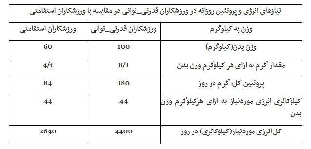 ورزشکاران قدرتی توانی روزانه نیازمند مصرف ۱.۷۶ گرم پروتئین به ازای هر کیلوگرم وزن بدن(تقریبا ۱۶۰ گرم برای یک فرد ۹۰ کیلوگرمی) هستند که این مقدار توصیه شده بیش از ۲ برابر میزان مورد نیاز برای افراد کم تحرک و غیرفعال است.