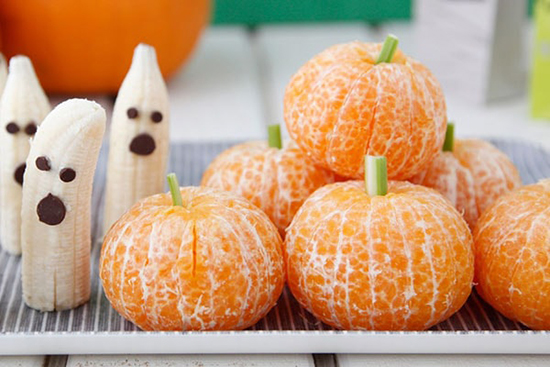 یکی از پذیراییهای سالمی که میتوانید در جشن هالووین داشته باشید، تزیین میوه هاست. موز و نارنگی دو گزینهی عالی برای این کار هستند. موزها را پوست بگیرید و نصف کنید. از چیپس شکلات کوچک برای چشمها و از چیپس شکلات بزرگتر برای دهان استفاده کنید. با این روش روحهایی از جنس موز خواهید داشت. هم چنین نارنگیها را پوست بگیرید و برش کوچکی از ساقه کرفس روی آن بگذارید تا طرحی مشابه با کدو تنبل داشته باشد.