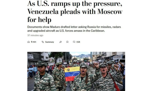 روزنامه امریکایی واشنگتن پست در گزارشی مدعی شده که در پی فشارها و تهدیدات امریکا، رئیس جمهور ونزوئلا با ارسال نامهای به همتای روس خود از وی خواسته تا برای دفاع در برابر تجاوز احتمالی امریکاییها، به نیروهای مسلح این کشور کمک کند. در این نامه مادورو از پوتین خواسته تا برای آماده نگه داشتن تسلیحات و تجهیزات ارتش روسیه به کاراکاس کمک کند.